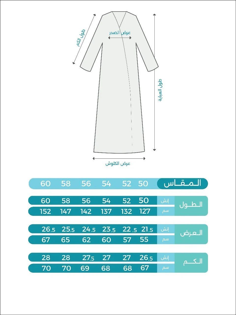 عندنا مقاسات متنوعة تناسب كل الأجسام: 50، 52، 54، 56، 58، 60